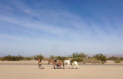 A man, his broom, his dog, his 2 horses go for a walk down a dusty desert road