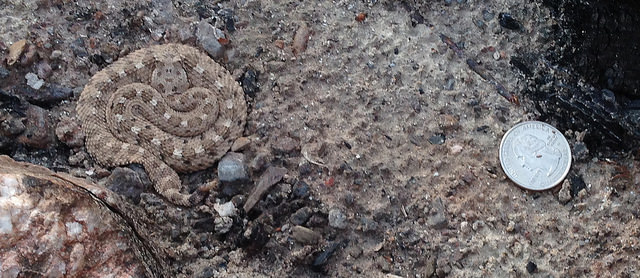 This little guy, a baby Sidewinder Rattlesnake, was in a campfire ring that a friend, Charlene, had her hand in, arranging the kindling and wood for that night’s campfire. I threw the quarter down next to him to show just how small he was – too tiny for a real rattle and still trying to sink into the sand to disappear away from us. He never moved a muscle. Or batted a rattlesnake eyelash. Charlene did a fine job of scooping him into my bucket and the next morning, relocated him quite a ways away from our camp. I kept thinking about his up-to-seventeen-more siblings and his mom – were we going to find them nearby?